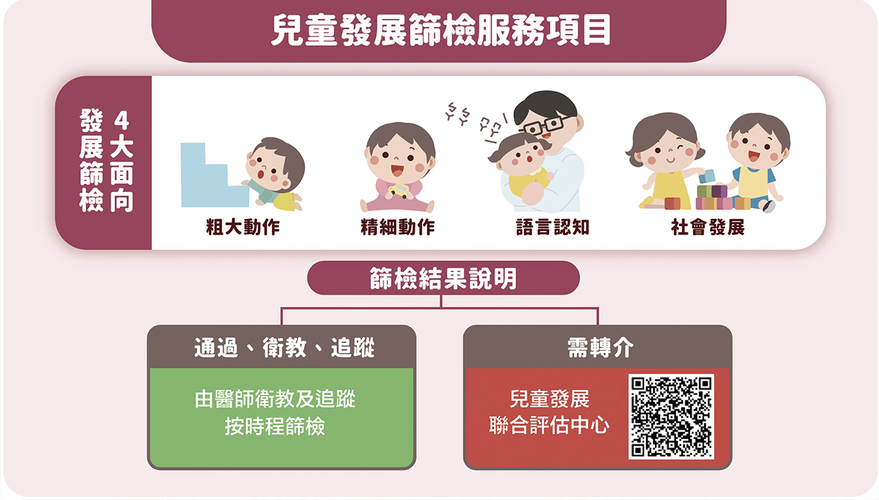 透過早期之評估、診治及介入,可使兒童的發展遲緩現象減輕,只要掌握時機和方法,及時衛教、追蹤或治療,並讓各種醫療復健、特殊教育、家庭支持、福利服務等資源即時介入,發展遲緩的孩子也大有機會得到改善,甚至趕上一般人。但在充滿未知與跟時間賽跑的情況下,家長往往心急茫然,不知找哪家醫院、掛哪一科,才能得到醫療資源與協助,因此衛福部積極有效運用國家資源,推動「兒童發展篩檢服務新制」,整合並增加「兒童發展聯合評估資源」,多管齊下守護孩子的健康。由兒科、家庭醫學科、幼兒專責醫師,及不同專科和不同職類醫療團隊,一棒接著一棒,陪伴疑似發展遲緩個案與家庭,走過篩檢、評估、確診以及銜接到後續的介入等過程。