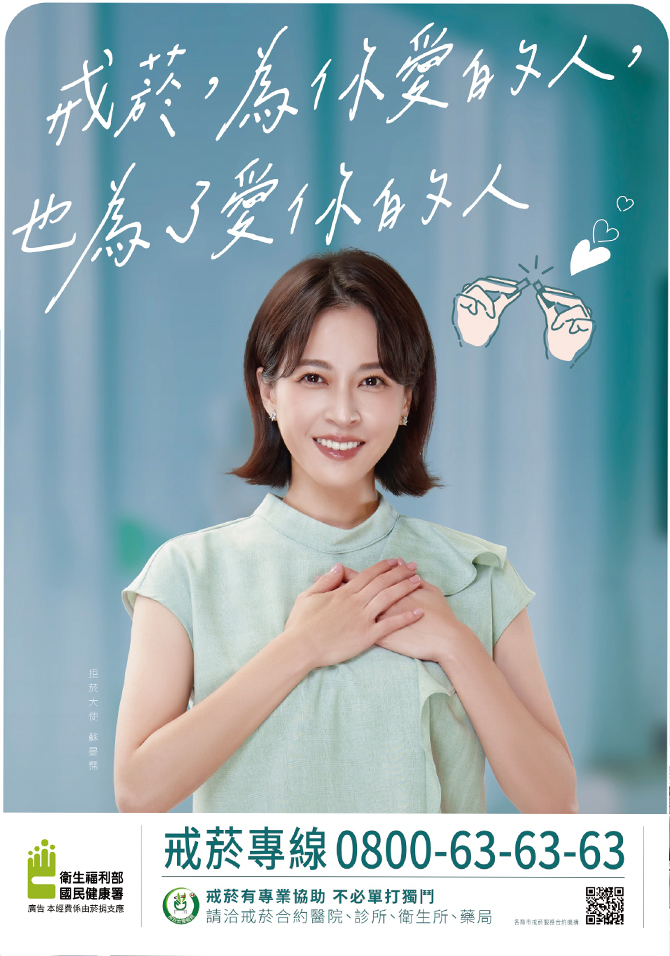 八點檔女神蘇晏霈化身「菸害防制大使」,挺身強調戒菸的重要性,鼓勵大家為身邊重要的長輩送上一份最貼心的重陽祝福:「戒菸,讓愛延續更久」。