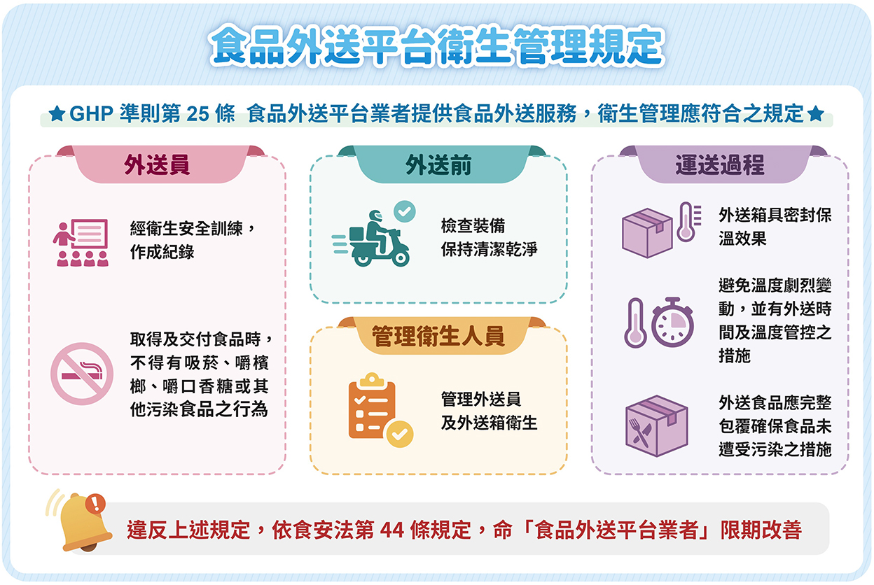 隨著飲食型態日益多元,食品供應鏈的樣貌早已不再局限於工廠與門市之間。外送平臺服務快速興起,成為現代人飲食不可或缺的一環,衛福部食品藥物管理署2019年9月針對外送平臺業者的運送服務,應符合食安法相關規定及資訊揭露責任訂定「網路美食外送平台業者自主衛生管理指引」,供外送平臺業者依循,本次修正《食品良好衛生規範準則》將該指引內容納入,食品外送平臺業者應負責外送員及提供食品外送過程衛生管理。要求外送員需經衛生安全教育訓練,「取得」及「交付」食品時不得抽菸、嚼檳榔等,外送箱體需具備密封保溫功能、定期清潔,並指派衛生管理人員管理外送員及外送箱的衛生;物流環節則要求業者在運送過程中,外送食品完整包覆,避免溫度劇烈變動,並確保食品未遭受污染及外送時間與溫度的管理措施。