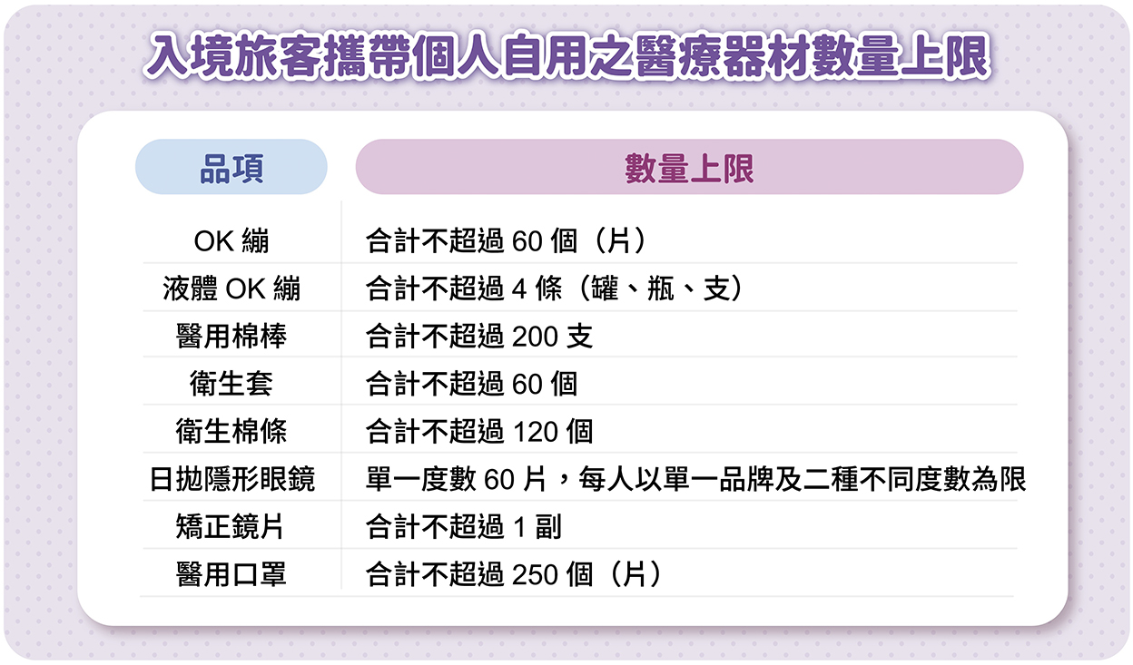 除了藥品,許多看似日常生活中經常使用的用品,像是日拋隱形眼鏡、OK繃、衛生棉條等,在臺灣都被歸類為「醫療器材」,如以便捷通關方式攜帶入境,都有數量上限。
