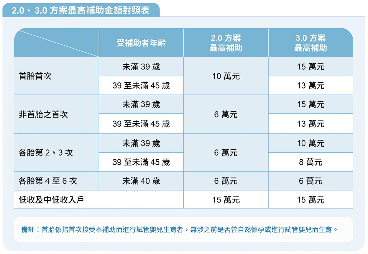 不孕症試管嬰兒補助從針對低收、中低收入不孕夫妻起步,2021年上路的2.0方案已擴大對象至未滿45歲不孕夫妻,並將次數從1年1次增為未滿40歲每胎最多6次,滿40歲至未滿45歲每胎最多3次;在擴大補助上,更給予低收入戶、中低非低收入戶每次療程15 萬元、非低收、中低收入戶首胎首次療程最高10 萬元、再次進入療程最高6 萬元的補助。輔以人工生殖機構從20家倍增到93家、機構代申請與線上審核及2021年7月全面增加產檢次數與項目等幫助,2.0方案在2021年7月至2025年10月底推動期間,協助約2萬6千多對夫妻迎接超過3萬1千名新生兒。這些嘗試透過試管嬰兒生殖的夫妻們共有約7萬對,總補助金額合計達到了75億元,平均減輕夫妻約53%左右的經濟負擔。